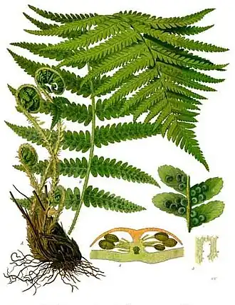 Description: The half-evergreen leaves have an upright habit and reach a maximum length of 1.5 m, with a single crown on each rootstock. The bipinnate leaves consist of 20-35 pinnae on each side of the rachis. The leaves taper at both ends, with the basal pinnae about half the length of the middle pinnae. The pinules are rather blunt and equally lobed all around. The stalks are covered with orange-brown scales.