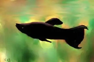 Description: This species is one of the most well-known aquarium fishes and nearly as easy to keep and prolific as guppies (for optimal health and breeding success, they demand fresh vegetable food like algae). There are several other popular breeds, like the golden molly nicknamed "24 karat", or the balloon molly, which however has a deformed spine and a decreased lifespan due to the associated health problems. Also, breeds with altered caudal fin structures like lyretails exist. The wild form is in fact quite rarely kept, as it has a rather plain silvery coloration suffused with brown and green hues. If given good care with ample sunlight, high water temperatures and fresh vegetables, they will, however, prove charming fish who make up for their somewhat plain coloration with their lively behavior.