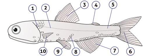 (1) - operculum (gill cover), (2) - lateral line, (3) - dorsal fin, (4) - adipose fin, (5) - caudal peduncle, (6) - caudal fin, (7) - anal fin, (8) - photophores, (9) - pelvic fins (paired), (10) - pectoral fins (paired)
