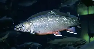 Description: The brook trout is of dark green to brown basic coloration with a distinctive marbled pattern (called vermiculations) of lighter shades across the flanks and back and extending at least to the dorsal fin, and often to the tail. There is a distinctive sprinkling of red dots, surrounded by blue haloes, along the flank. The belly and lower fins are reddish in color, the latter with white leading edges. Often the belly, particularly of the males, becomes very red or orange when the fish are spawning. The species reaches a maximum recorded length of 86 cm (33 in) and a maximum recorded weight of 9.4 kg (21 lb). It can reach at least seven years of age, with reports of 15-year-old specimens observed in California habitats to which the species has been introduced.