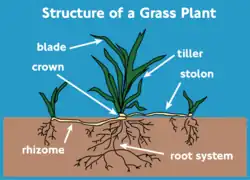 Grass blades grow at the base of the blade and not from growing tips. This location of the grass growing point near the ground allows it to be grazed or mowed regularly without damage to the growing point.