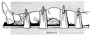 Carefully straighten the injured limb. Immobilize the fracture by placing a padded board under the injured limb. The board should be at least 4 inches wide and should reach from the but- tock to the heel. Place extra padding under the knee and just above the heel, as shown in the illustration. Use strips of bandage to fasten the leg to the board in four places: (1) just below the knee; (2) just above the knee; (3) at the ankle; and (4) at the thigh. DO NOT COVER THE KNEE ITSELF. Swelling is likely to occur very rapidly, and any bandage or tie fastened over the knee would quickly become too tight. Treat the victim for shock and evacuate as soon as possible.