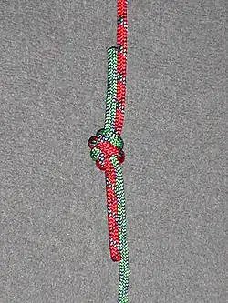 Another common use for this knot is to back up a critical knot, such as a harness tie-in knot or single-line rappel rigs. In this use, the running end is tied around the standing end of the rope, so that it cannot slip back through the knot.