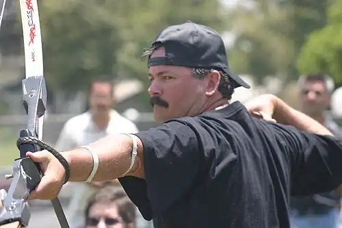 A standard "Olympic Bow" is a recurve (not compound) bow with no more than 3 stabilizer extensions, a sight, and a clicker. An archer must use fingers and not a mechanical release and may not have a string peep sight or magnified aiming device.