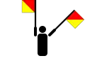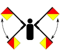 The newer flag semaphore system uses two short poles with square flags, which a flagperson holds in different positions to signal letters of the alphabet and numbers. The flagperson holds one pole in each hand, and extends each arm in one of eight possible directions. Except for in the rest position, the flags cannot overlap. The flags are colored differently based on whether the signals are sent by sea or by land. At sea, the flags are colored red and yellow. While on land, they are red and white.
