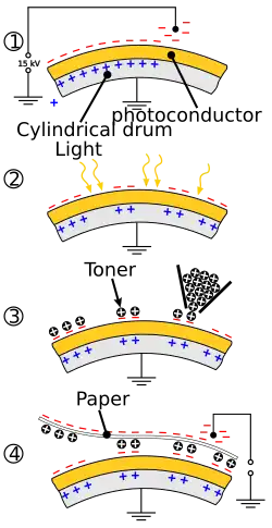 - First, the surface of a cylindrical drum is given an electro-static charge by a high-voltage wire called a corona wire. The drum is coated with a photoconductive semiconductor material, such as selenium or germanium.