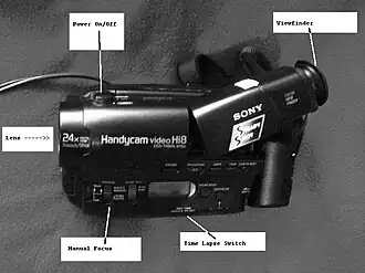 The video camera can also be powered using household electricity. In the photo above (with the labeled parts), you can see a wire leading away from the video camera. An adaptor is attached to the video camera where the battery usually goes, and is providing power to the video camera.