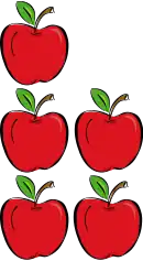 3 + 2 = 5 with apples, a popular choice in textbooks.