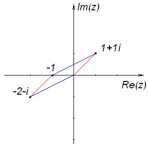 There are two complex numbers drawn in the plane; viz., 1 + i, -2 - i. Their sum is plotted on the graph, -1. The red and blue lines demonstrate how geometrically, a parallelogram can be constructed, and their apex forms their sum.