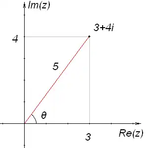 On this diagram we can see the number 3 + 4i. The red line is the distance away from the origin (the number 0 + 0i). The gray line represents the distances away from the respective axes. We can see that the red line makes an angle θ from the real axis.