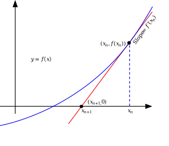 As shown in the illustration, this is nothing else but the construction of the zero from the tangent at the initial guessing point. In general, Newton's root finding method converges quadratically, except when the first derivative of the solution vanishes at the root.