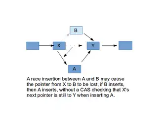If N gets to update X -> first, then when M tries to update X -> , its copy of X -> Y , which it got before doing M -> Y , does not match X -> N , so CAS returns non-zero flag set (recall that CAS requires the user to load the accumulator with the expected value, the target location's current value, and then atomically updates the target location with a source location if the target location still contains the accumulator's value). The process that tried to insert M then can retry the insertion after X, but now the CAS checks ->N is X's next pointer, so after retry, X->M->N->Y , and neither insertions are lost.