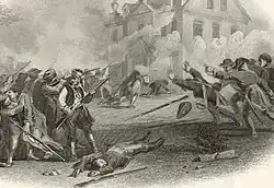 To clear a path for the British, Knyphausen launched a frontal attack. He bombarded the Americans with heavy artillery. He had crossed the Brandywine at several places. His main column fought through the American resistance at Chad’s Ford. A smaller British force crossed at Gibson's Ford to the south. They threatened the American militia posted at Pyle's Ford. The Americans fought hard despite being outnumbered. They seemed to be holding their ground, but soon British reinforcements arrived. The Americans were defeated.