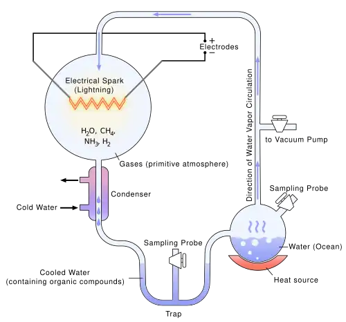 The experiment used water (H2O), methane (CH4), ammonia (NH3), and hydrogen (H2). The chemicals were all sealed inside a sterile array of glass tubes and flasks connected in a loop, with one flask half-full of liquid water and another flask containing a pair of electrodes. The liquid water was heated to induce evaporation, sparks were fired between the electrodes to simulate lightning through the atmosphere and water vapor, and then the atmosphere was cooled again so that the water could condense and trickle back into the first flask in a continuous cycle.