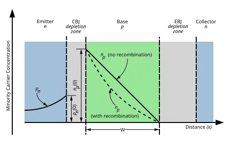 Because the electrons here are in a p-type material populated with holes, some will recombine with the holes in the base. Due to the base being very thin, this is a small proportion of the total number of electrons. This effect causes the electron concentration in the base to be slightly non linear (dashed line in the above diagram). Because the concentration is higher near the EBJ, we expect a larger number of electrons to recombine per unit length than we do at the CBJ, so the line is steeper at the EBJ, leading the "dished" shape shown in the diagram.