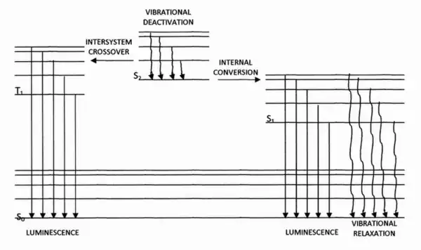 Before luminescence occurs, there is a non-radiative loss of energy (due to collisions between molecules) as the excited state relaxes to a lower vibrational state while remaining at the same electronic energy level. This type of transition is called vibrational deactivation. It has to occur even more rapidly than fluorescence and typically occurs within 10−12 s of excitation. Therefore the luminescence involves the emission of photons of lower energy (higher wavelength) than would otherwise be the case. Another possible transition is internal conversion, in which an electron transfers from a lower vibrational state of a higher electronic energy level to a higher vibrational state of a lower electronic energy level, without any significant gain or loss of energy; such a transition, S2 → S1, is shown schematically in Figure 1.1. In intersystem crossing, internal conversion would involve also reversal of the spin of the electron as in a transition from a singlet to a triplet state; the transition S2 → T1 in Figure 1.1 is of this type. Such transitions can give rise to phosphorescence. Finally, luminescence is not inevitable. The intensity of the emission compared with the number of molecules in the excited state is called the quantum yield(ΦF). This can be calculated for fluorescent emission by dividing the number of emitted photons by the number of absorbed photons. ΦF in a chemiluminescence phenomenon should be the same as in the fluorescence phenomenon involving the same excited state, but, because chemiluminescence does not depend on the absorption of photons, it can be calculated in the same way only by performing a separate fluorescence experiment. The intensity of chemiluminescence emission is more meaningfully compared with the number of reactant molecules; this measure is called the chemiluminescence quantum yield (ΦCL). It is related to ΦF by the equation: