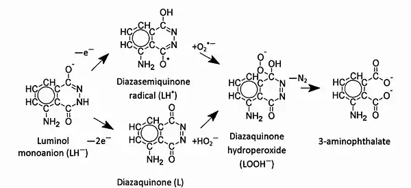 - ↑ Merényi G, Lind J and Eriksen T E, Luminol Chemiluminescence: chemistry, Excitation, Emitter, J. Biolumin. Chemilumin., 1990, 5, 53.