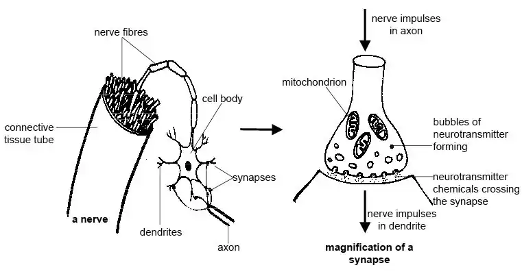 The connection between adjacent neurons is called a synapse. The two nerve cells do not actually touch here for there is a microscopic space between them. The electrical impulse in the neurone before the synapse stimulates the production of chemicals called neurotransmitters (such as acetylcholine), which are secreted into the gap.