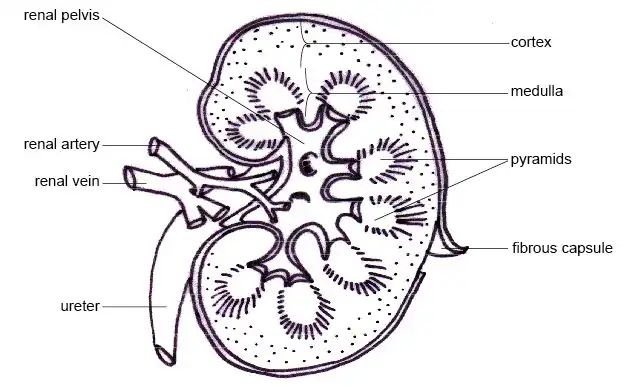 - A kidney consists of an outer region or cortex, inner medulla and a cavity called the pelvis that collects the urine and carries it to the ureter.