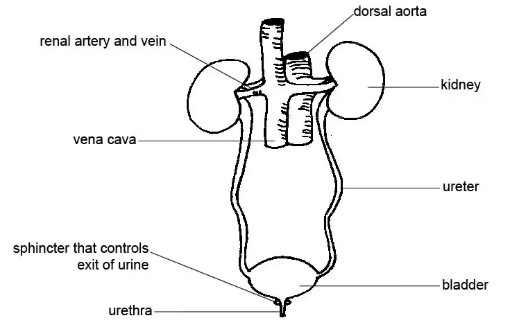 1. Add the following labels to the diagram of the excretory system shown below. Bladder | ureter | urethra | kidney | dorsal aorta | vena cava | renal artery | vein