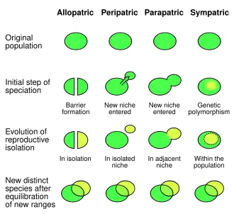 In allopatric speciation, two subgroups of a population become geographically isolated from each other (i.e., allopatric populations) through geographical or geological events. As these isolated populations undergo genotypic and phenotypic divergence, they are subjected to different selective pressures and may undergo genetic drift. New species form when the populations evolve independently such that they are no longer able of exchange genes when they come back into contact.