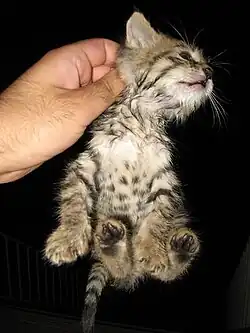 If a kitten is (gently) handled and played with consistently from a very young age, it will be much more willing to be held when it is older. This will make it much easier to put in a pet carrier, give pills, take to the veterinarian, and so forth. Cats that do not appreciate being picked up and held can often be very difficult to deal with in these situations. Kittens can also be socialized with dogs; if a kitten grows up with a friendly dog in its environment, it is much less likely to become intimidated and scratch a dog when it is adopted.