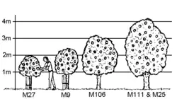 Most modern apple rootstocks were bred in the 20th century. Much research into the existing rootstocks was begun at the East Malling Research Station in Kent, England. Following that research, Malling worked with the John Innes Institute and Long Ashton to produce a series of different rootstocks with disease resistance and a range of different sizes, which have been used all over the world.