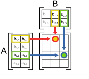 Multiplication of two matrices is defined only if the number of columns of the left matrix is the same as the number of rows of the right matrix. If A is an m-by-n matrix and B is an n-by-p matrix, then their matrix product AB is the m-by-p matrix whose entries are given by dot product of the corresponding row of A and the corresponding column of B[2]