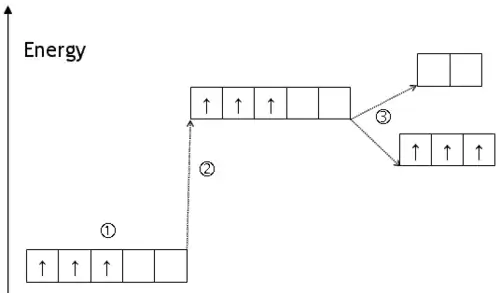 ③. Critically, the ligands will come closer to some d-orbitals than to others. Typically, two or three of the orbitals will be destabilised more than the remainder.