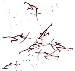 In terms of speculating about the consciousness of these artists, it is particularly worth noting that at Lascaux, in what was originally called the Cave of the Dead Man, we could a semiotic effort to talk about the human soul. The "reality" of the representation of all animal figures is very high grade. The one human figure in the cave is done as a stick figure. In the foreground stands a staff surmounted by a bird figure.