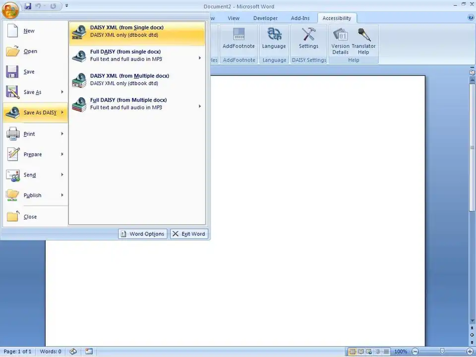 In an effort to make content more accessible for the blind and print disabled Microsoft joined with the DAISY Consortium on the Save as DAISY project. Microsoft's contribution is an add-in to the popular Microsoft Office suite that allows anyone to save a document in a standard accessible format. The add-in can be downloaded at http://www.openxmlcommunity.org/daisy/. It is easy to use, it creates as SAVE AS DAISY option within Microsoft Word and walk you through formatting options (see image below).