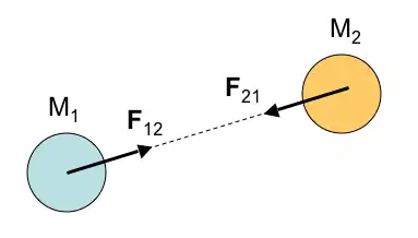 The force acting on M1 is denoted as F12, and the force acting on M2 is denoted as F21. We know from Newton's third law of motion that the two forces must be equal in magnitude, but opposite in direction: