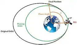 Orbit phasing is the adjusting of the true anomaly of a spacecraft's orbit, which can be done to conduct a rendezvous between two spacecraft. It is done by going into a certain phasing orbit that will change the true anomaly by an angle called the phasing angle. If the spacecraft is behind the target position in the same orbit, then a smaller orbit is required to "catch up" to the position. If the spacecraft is ahead of the target position, then the spacecraft will have to go into a larger orbit to "slow down" to that point.