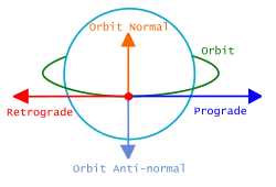 To change your orbit in space, you must first determine what direction your spacecraft is pointing. The "forward direction," or the direction in which you are moving, is usually labeled "Prograde" The opposite direction is usually labeled "Retrograde".