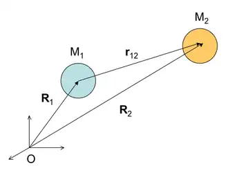 where is the relative position vector of mass 1 with respect to mass 2, expressed as: