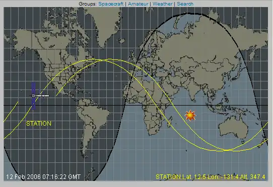 The earth rotates with respect to the orbit, which means that the orbital plane is essentially stationary in space while the earth rotates. The sine wave formed by the ground track is displaced by the number of degrees each orbit by the number of degrees that the earth rotates during the orbital period. The image below shows a satellite ground track through two of earth's rotations: