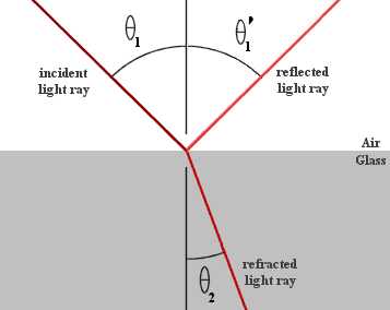 | In this illustration, the incident beam of light strikes a glass surface at an angle θ1. A portion of the light energy is refracted through the glass at angle θ2. Most of the remaining light energy is reflected at angle θ'1. |