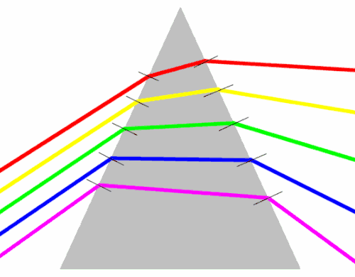If the light passes through a transparent material with parallel sides, such as a sheet of glass, the beam will emerge at the same angle as it entered. However when the two sides are not parallel, the angle will vary depending on the frequency. This is the principle behind the prism. A glass prism is used to separate the photons from a light source into a spectrum of frequencies from red to blue. A similar principle is what creates a rainbow as the light from the sun passes through droplets of water.