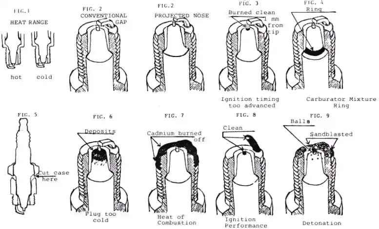 You will see small balls of fuel and metal deposits on the porcelain tip and smaller balls of debris on the electrode tip. The metal case will look as if it were sandblasted (inside the engine the piston will also look sand blasted). See figure 9.