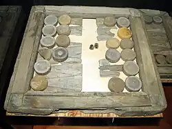 The ancient Egyptians played a game called senet, which resembled backgammon,[2] with moves controlled by the roll of dice. The Royal Game of Ur, played in ancient Mesopotamia, is a more likely ancestor of modern tables games. Recent excavations at the "Burnt City" in Iran showed that a similar game existed there around 3000 BC. The artifacts include two dice and 60 pieces, and the set is believed to be 100 to 200 years older than the sets found in Ur.[3]