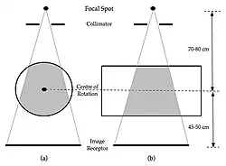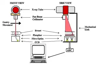 - the image is acquired line by line by scanning the fan-shaped X-ray beam across the breast at a constant speed - see Figure 7.25. This form of image acquisition is analogous to the Scanned Projection Radiography image, also called Scout View, used in Computed Tomography (CT) scanning,