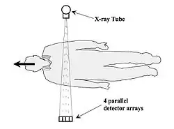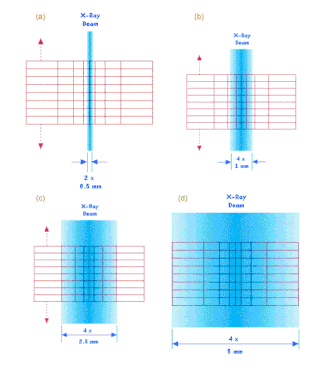 - the X-ray beam is collimated to a fan of narrow width (e.g. 22 x 1 cm), giving high level of scatter rejection,