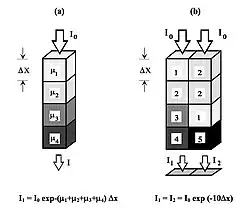 - where μc, ρc and tc are the mass attenuation coefficient, concentration and thickness, respectively, of the contrast medium. Thus, when I2 is subtracted directly from I1, the subtracted image is given by: