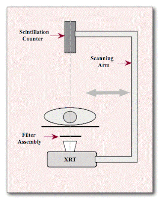 - The DEXA technique typically involves an X-ray tube and scintillation detector mounted on a C-arm arrangement - see Figure 7.18 - so that the patient is exposed to a pencil X-ray beam scanning in a rectilinear fashion. The pencil beam is used to reduce the detection of scattered radiation and the scintillation detector typically consists of a CdWO4 or NaI(Tl) scintillator coupled to a photodetector. The filter assembly is used to switch filters and calibration standards into and out of the pencil beam at appropriate intervals. Scan times with this approach are of the order of 2 to 5 minutes, depending on the examination, which are reduced in second generation instruments where a fan-shaped X-ray beam and an array of detectors are used. By rotating the C-arm around the patient during the scan in the second generation devices, a CT image can be formed. The output of the scintillation detector is fed to a computer for dual-energy data processing and image display. A host of body composition parameters can be derived from the image data, e.g. bone mineral density and soft tissue composition.