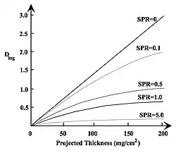 - Figure 7.3 illustrates the dependence of Dlog on the projected thickness of contrast medium for a range of scatter-to-primary ratios (SPRs), i.e. the ratios of the intensities of detected scattered and primary radiation. These plots were generated by including scatter contributions in the above analysis. It is seen in the figure that Dlog is reduced significantly as the SPR increases and that the dependence on projected thickness becomes non-linear. For example, it is seen that Dlog is reduced, at a projected thickness of 50 mg cm-2, by about 85% when the SPR=5 relative to the no scatter condition, i.e. the contrast of an opacified blood vessel will be reduced by this factor. In addition, it is seen that Dlog becomes relatively independent of projected thickness, above about 20 mg cm-2 when SPR=5, for example, so that the ability to discriminate different projected thicknesses, and hence vessel opacity, is significantly impaired.