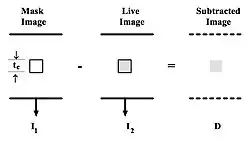 - The process of subtraction angiography, as illustrated simplistically in Figure 7.2, involves the subtraction of a post-opacification image (commonly called the Live image) from a pre-opacification image of the same region (commonly called the Mask image). When it is assumed that monoenergetic X-rays irradiate the patient and that no scattered radiation is generated, the radiation intensity, I2, for an appropriate point of the live image is related to the intensity, I1, for the same point of the mask image, by: