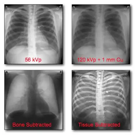 - A chest radiograph acquired at 56 kV is shown in the top left panel of the figure. This is referred to as a low energy image. In the top right panel is a radiograph of the same patient's chest acquired at a high energy - 120 kV, with 1 mm copper filtration. Results of the dual-energy processing are shown on the bottom row. The bone-subtracted image is shown in the bottom left panel and the tissue-subtracted image in the bottom right panel. Notice that the tissue-subtracted image demonstrates that the lesion in the patient's left lung is a calcified nodule, since it doesn't appear in the bone-subtracted image. Simulated X-ray spectra for the two different kilovoltages are shown in Figure 7.17a to illustrate the energy separation that can be achieved using these exposure factors.