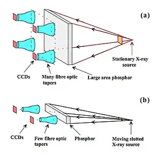 Fig. 7.24: (a) A large phosphor screen coupled to several CCDs using fibre optic tapers; (b) A scanning-slot system where a narrow phosphor screen is coupled by the fibre optics to a few CCDs and the XRT/detector is scanned across the anatomy.