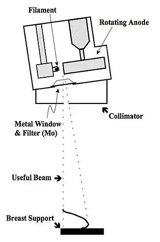 - Most X-ray tubes used for contact mammography have small focal spots (e.g. 0.3 mm) which are less than half the size used in general radiography. Such small focal spots are needed to image fine detail such as microcalcifications, that may be no larger than 100 μm. The resultant heating of the XRT anode can limit tube currents to a maximum of no more than ~100 mA at 25 kV so that long exposure times up to 3 seconds or more are needed to compensate. Patient movement therefore needs to be suppressed during the exposure.