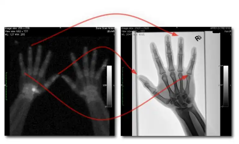 - The registration process generally assumes that a correspondence exists between spatial locations in the two images so that a Coordinate Transfer Function (CTF) can be established which can be used to map locations in one image to those of the other. In the above example, as in many clinical situations, a number of compatibility issues need to be addressed first. The obvious one arises from the different protocols used for image acquisitions, i.e. a palmar view in the bone scan and a posterior-anterior (PA) projection radiograph. We can handle this issue in our example case by extracting the right hand data from the bone scan and then mirroring it. A related issue arises when different digital resolutions are used - in this case, the nuclear medicine image was acquired using a 256 x 256 x 8-bit resolution, while the radiograph was acquired using a 2920 x 2920 pixel matrix with a 12-bit contrast resolution.